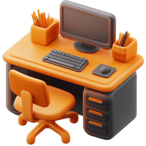 3D-Icon eines Büroarbeitsplatzes mit Schreibtisch, Stuhl und Computer